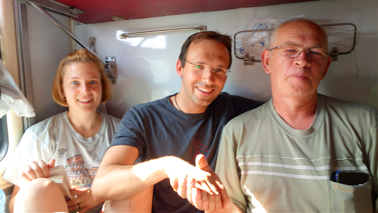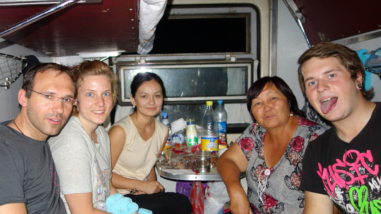 Nun sitzen wir also in diesem Nachtzug Moskau – Almaty in der günstigsten Klasse. Alle Betten sind belegt, das kann ja heiter und stickig werden. Wir haben jedoch Glück, unsere Nachbarmitreisenden entpuppen sich als ganz angenehme Zeitgenossen. Da gibt es den großen, bulligen Bodyguard, der einen richtig fiesen Händedruck hat. Kubik, ein lustiger Kirgise, der uns hartnäckig überreden will, den Aralsee Aralsee sein zu lassen und zum Baden mit nach Kirgisien zu fahren, seine Frau würde uns dort am Bahnhof abholen. Visa? – entgegen wir. Ach, das kriegen wir schon hin, meint er. Tatjana, eine Russin, die ihre Kinder in Moskau besucht hat und uns geduldig Russischnachhilfe gibt. Elena, eine junge Hebamme, Jana, eine Usbekin, die von der Hochzeit ihres Sohnes kommt. Zwei lustige Omis aus Kirgisien, die auf Deutsch bis 6 zählen können und viele mehr.