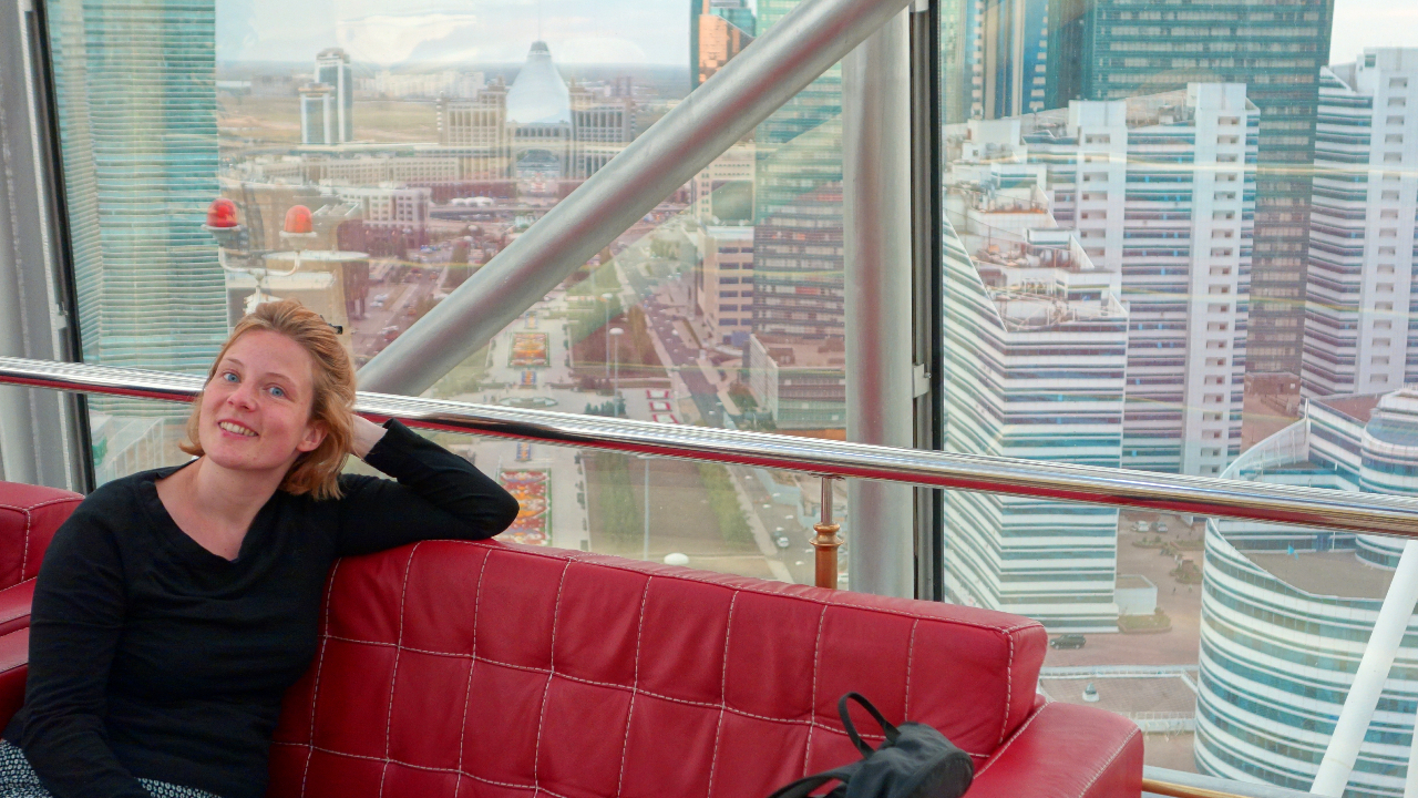 Franzi relaxt im Baiterek Tower, dem Wahrzeichen der Stadt
