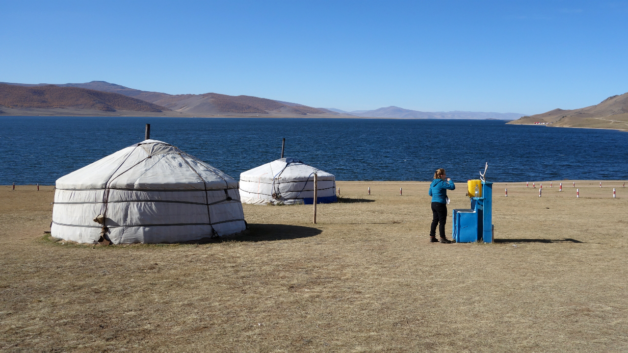 Ein kleines Highlight ist der Besuch der heißen Quelle am vierten Abend. Wir sind die einzigen Besucher und genießen das Bad im warmen Wasser des Außenbassins. Außerdem ist es die erste und einzige Gelegenheit in dieser Woche, uns zu waschen. Die letzten Stationen unseres Trips sind der rote Wasserfall und die kleinen Sanddünen des Khugnu Khaan Naturreservats. Unterwegs kreuzen immer wieder Herden von Ziegen, Schafen, Yaks und Pferden unseren Weg, manchmal in Begleitung eines Mongolen auf Pferd oder Motorrad, meist aber ohne. Die vereinzelten Jurten in der Ferne machen den Eindruck von ruhiger Entspanntheit. Es ist schade, als wir nach 7 Tagen von unseren Reisebegleitern Abschied nehmen müssen, aber die Aussicht auf Dusche und Waschmaschine ist auch verlockend.