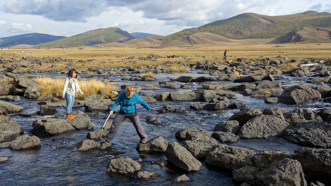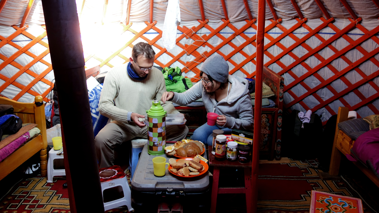 Around 6 am some host family member comes to heat the stove again. A kind of luxury we are very thankful for. Around 8 am we mostly get up, have breakfast in the ger and leave for the trip of the day. We have lunch on the road. Therefor we stop by a rover, a mountain or in the wood and Tseenee is preparing food in the back of the van using two camping stoves. It tastes delicious, but what bothers me a bit is how the dishes are cleaned outdoor style. Everything is just cleaned by some cloth and cold water and at dinner you can still taste some notions of breakfast and lunch. What is also something to get used to is the way Mongolians eat and drink. Everything liquid is noisily slurped and food is literally vacuumed off the spoon. Indeed it is easier to do so and we will have to get used to European eating once we return back home. 🙂