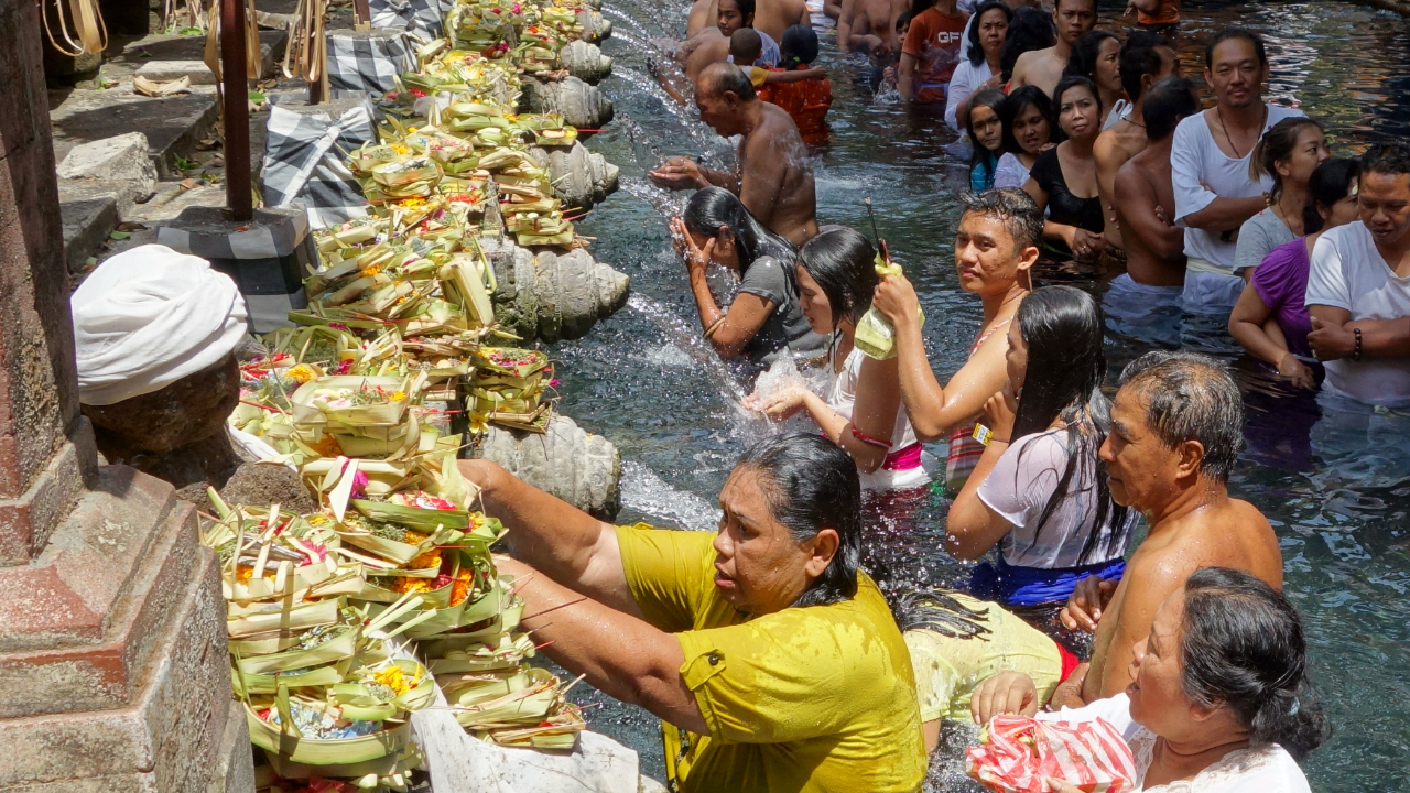 Ein paar Kilometer weiter besichtigen wir den größten hinduistischen Tempel auf Bali, den Besakhi Tempel. Es hat uns ziemlich überrascht, dass es hier auch Bereiche gibt, in denen alle anderen Religionen ihren Gebeten nachgehen dürfen. Die Zeremonie, die morgens im Tempel stattgefunden hat, haben wir leider verpasst. Später haben wir aber noch Glück, in einem Örtchen ist eine traditionell gekleidete Prozession gerade auf dem Weg zu ihrem eigenen kleinen Tempel. Zur Feier des Tages werden ein paar Schweine geschlachtet, was wir hautnah miterleben, seitdem bin ich vorerst Vegetarier.
