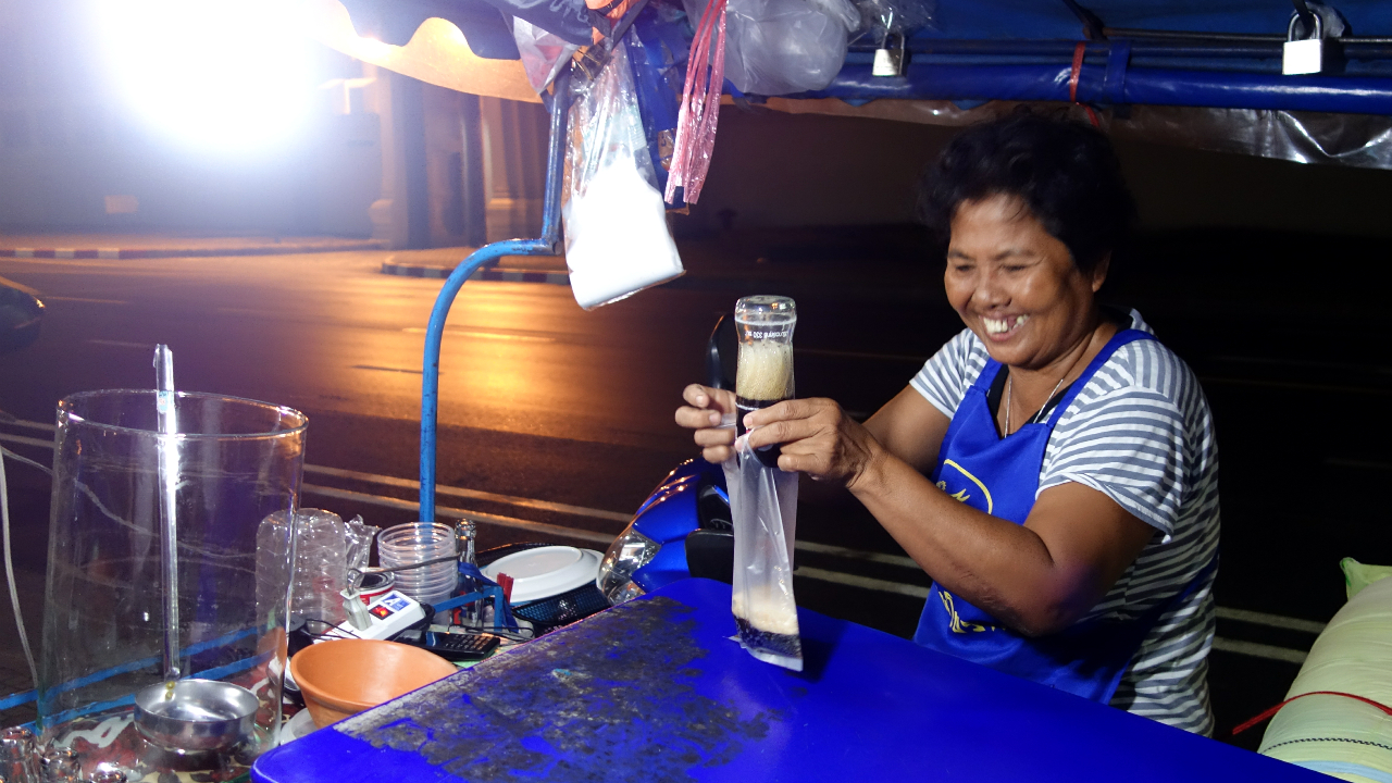 Cola mit Eiswürfeln aus der Plastiktüte beim Straßenhändler