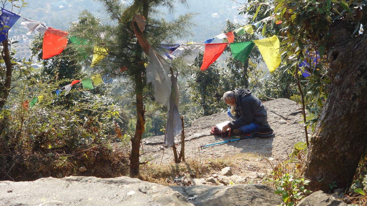 Christmas went by almost unnoticed. The least bars and restaurants were decorated for Christmas. Anyway there were hardly any Christians, except for maybe some of the other tourists. One of the few hints to Christmas was a creative Indian dressed up as Santa Claus shuffling around the centre distributing sweets in the evening. We decided to not give us any gifts this year. The big trip is the biggest gift of all. During the festive days we just enjoyed the peacefulness, our sunny roof top terrace on top of our new and cheaper hotel, and the great view over the snow covered mountains. From time to time we took small trips to the places of interest in McLeod. We visited the temple of the Dalai Lama, followed the prayer walk passing all the prayer drums and the huge memorial wall with all the portraits of self-immolated Tibetans. Everywhere between the trees there were hanging Buddhist prayer flags in the five colors representing the elements in the Buddhist belief. On these flags were printed praying mantras. It is believed that by flapping in the wind these prayers will directly be carried to heaven.