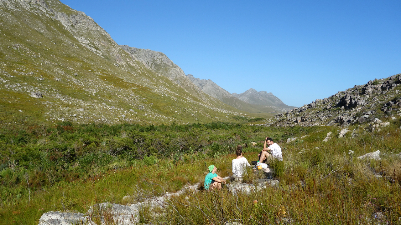 Cape Town has some truly beautiful spots to offer. Our first days were full of fantastic impressions; visiting Signal Hill for sunset with a stunning view over the whole city, or cruising along Chapman’s Peak Drive with its wonderful beaches and bays, just to name a few. After a week full of family meetings and activities in the city the four of us packed our bags and a lot of food to go to Kogelberg Nature Reserve. There is only one lodge in the whole Reserve and this one only has five cottages. It was not actually cheap but therefore it was ecologically sustainable. The houses are made of wood and glass and instead of a water toilet flush there was a bucket of soil. Having this beautiful nature around us and the total silence we could really calm down and relax. In the evening Jason prepared us braai with austrich steaks and a typical South African beef stew cooked in the so called Potjie Pot (a cast-iron three legged cauldron that is placed directly in the fire). During the day we went on a nice and modest hike along Palmiet river and of course we jumped into one of the many natural pools of the river.