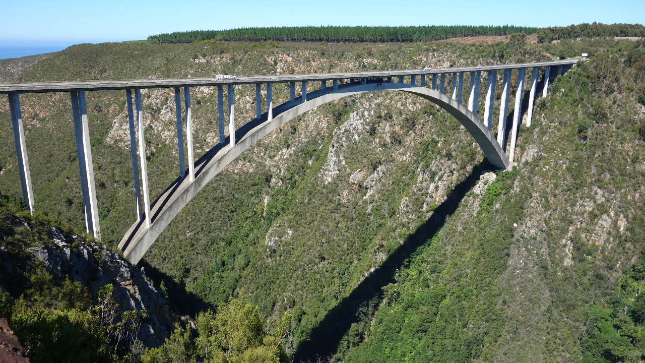 Mit Oudtshoorn als Basis nehmen wir uns einen Tag Zeit, um den Swartberg-Pass zu fahren, den uns österreichische Urlauber empfohlen haben. Es ist nur ein Schotterpiste, aber unser Sparky schlägt sich wacker. Der Ausblick, sowohl beim Hinauf- als auch beim Hinunterfahren ist es 100 Mal wert. Auf ganz normalen Straßen geht es am nächsten Tag dann weiter bis nach Knysna. Knysna liegt so ganz grob auf halber Strecke zwischen Kapstadt und Port Elisabeth, das Ende der Garden Route. Für viele, die die Garden Route in zwei Tagen fahren, ist dieses kleine Städtchen an der großen Lagune der bevorzugte Übernachtungsstopp. Entsprechend ist es touristisch sehr gut ausgebaut, mit einer Uferpromenade mit Restaurants und Cafés, per Auto leicht zugänglichen Aussichtspunkten auf die Meeresenge und diversen Freizeitangeboten. Alles sehr nett, aber nicht weltbewegend.