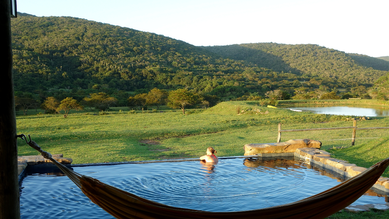 Das Beste an dieser Farm ist aber die Terrasse und das allabendliche Treiben. Vom Pool oder von der Hängematte aus kann man dem Sonnenuntergang zusehen und darauf warten, wie Gänse und Enten zur Fütterung kommen und sogar Springböcke und Zebras aus dem Wald kommen, um auf den Grasflächen vor dem Farmhaus zu weiden. In unserer letzten Nacht trampelt eine Kuhherde direkt vor unserer Tür umher. Wir werden unsanft geweckt und als Moppi die Tür aufmacht sieht er sich Auge in Auge mit einem ausgewachsenen Bullen. Beide sind aber so verschlafen, dass nichts weiter passiert und der eine weiter zur Weide trottet und der andere zurück ins Bett. Am nächsten Morgen verschlafen wir grandios und verlassen Südafrika mit einer gehörigen Verspätung, die noch Konsequenzen haben wird.