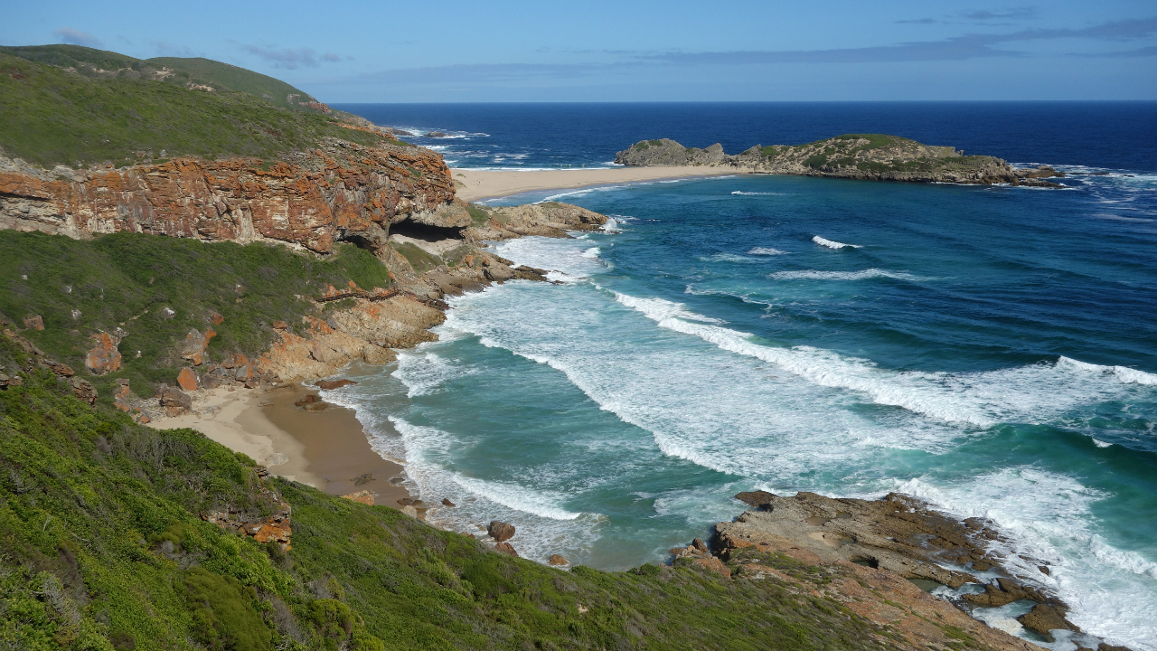 Von Knysna ist es eine knappe Stunde Fahrzeit bis zu unserem nächsten Ziel, dem Storms River im Tsitsikamma Nationalpark. Das heißt, genug Freiraum für einen ausgiebigen Zwischenhalt an der Plettenberg Bay. Touristische Infrastruktur hatten wir in Knysna genug, jetzt steht uns die Sinn wieder nach etwas ungestörter Natur. Die etwa 4 Kilometer ins Meer ragende Halbinsel im Süden von Plettenberg, kurz Plett genannt, ist dafür ein bestens geeigneter Ort. Auf ihr befindet sich das nur zu Fuß zugängliche Robberg Marine- und Naturreservat. Der Rundpfad über die Halbinsel ist wesentlich abwechslungsreicher als wir erwarteten hatten. Neben ganz bequemen Wanderstücken geht es abenteuerlich über riesige Geröllbrocken und auf flachen, rutschigen Felsen, beängstigend nah an der Brandung entlang. Der Schluss des Pfades führt an einer flachen Strandspitze vorbei, auf der ich ein bisschen verweile, während Moppi noch einen Abstecher auf eine kleine Vogelinsel am Ende der Strandspitze macht. Alles in Allem ein anstrengender, aber schöner Tagestrip.