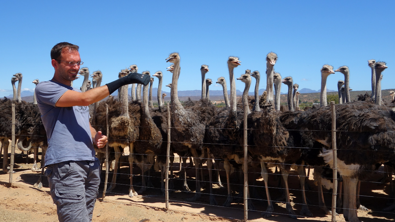 Auf Empfehlung von Hetsie und Emil geht es am nächsten Tag nach Oudtshoorn, der Ort in dem Hetsie aufgewachsen ist. Einige Kilometer bevor wir die Stadt erreichen, passieren wir die ersten Straußenfarmen. Die ganze Gegend um Oudtshoorn ist fest in der Hand der Straußenzüchter. Hier sind Strauße gängige Nutztiere von denen die Eier, das Fleisch, die Federn und die Haut verwertet werden. Aus Letzterem wird Leder gemacht, das in der Preisklasse und Exklusivität fast mit Krokodilsleder konkurrieren kann. Selbstverständlich gibt es für Touristen die Möglichkeit, die Farmen zu besuchen und da wir schon mal da sind, nehmen wir diese natürlich auch wahr. Während der sehr professionellen Führung in deutsch gibt es immer wieder kleine Action-Einlagen. Moppi probiert alles aus, vom Strauße füttern bis zum Strauße reiten.