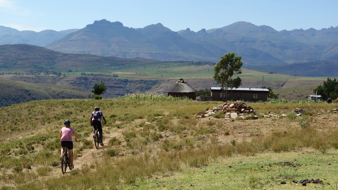 Malealea war einst eine der ärmsten Kommunen Lesothos. Die Tatsache, dass es den Leuten hier heute ganz gut geht, ist zu großen Teilen auch den Betreibern der Lodge zu verdanken. Die Lodge selbst beschäftigt viele Einheimische und alle Aktivitäten, wie Wandern, Dorfführungen, Radtouren oder Ponytrekking werden von den Anwohnern Malealeas durchgeführt und die Lodge vermittelt lediglich. Am beliebtesten sind die Ponytreks durch die Berge. Die klingen zwar auch für uns sehr spannend aber uns sind die Knieschmerzen vom Reiten in der Mongolei noch gut in Erinnerung. Deshalb entscheiden wir uns stattdessen für eine Mountainbikingtour durch die nähere Gegend. Unser Guide heißt kurioserweise Malealea, sein Großvater war einer der ersten Siedler im heutigen Dorf. Er nimmt uns ganz schön ran. Es geht hoch und runter, über Stock und Stein und durch Felder und Wiesen. Solche Radstrecken sind wir Großstadtradler gar nicht gewohnt. Unsere Hintern und die Oberschenkel erinnern uns am nächsten Tag noch an die wilde Fahrt.