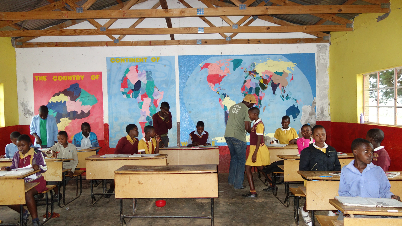 Die Tour durchs Dorf gestaltet sich da wesentlich entspannter. Wir sind gerade in der örtlichen Bierbrauerei eingekehrt, als sich die Himmelsschleusen öffnen. So bleibt uns nichts anderes übrig, als bei der Dorfbrauerin, die die Hälfte ihrer bescheidenen Hütte mit einem Tuch abgetrennt in eine Art Kneipe mit Getränkekisten als Sitzgelegenheit umgewandelt hat, auszuharren und noch einige ihrer, in einer Tonne gebrauten, Biere zu trinken. Einige Damen und Herren aus dem Dorf tun es uns gleich und wir lauschen dem gewaltig auf das Blechdach prasselnden Regen und den wahrscheinlich aktuellen Dorfneuigkeiten. Als der Regen nach einer Weile etwas nachlässt, kommt unser großes Highlight. Wir haben unseren Führer gefragt, ob wir die Dorfschule besuchen können. Das ist anscheinend nicht üblich, aber da wir nur zu zweit sind und es Freitag Nachmittag ist, geht es in Ordnung. Als wir ankommen laufen gerade die letzten 10 Minuten der letzten Unterrichtsstunde. Wir sind in einer 7. Klasse, die gerade eine Matheprüfung geschrieben hat. Die Aufgaben stehen noch an der Tafel und wir sind sehr beeindruckt – es ist nicht gerade trivial! Alle Aufgaben sind auf Englisch und bei mindestens einer Aufgabe sind wir sicher, dass dieses Thema in Deutschland noch nicht in der 7. Klasse behandelt wird.