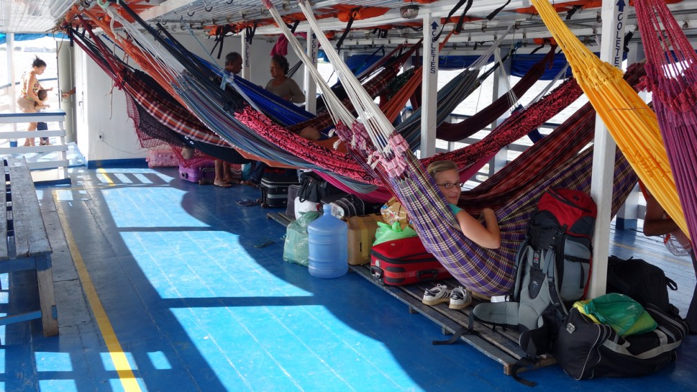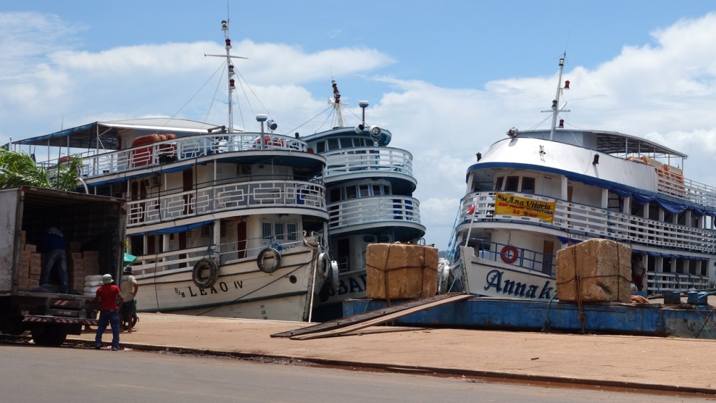 Am ersten Tag schlendern wir am Hafen entlang und versuchen, Tickets für die Fahrt auf dem Rio Tapajós zu buchen. Einfach ist das allerdings nicht. Der Pier erstreckt sich über mehr als einen Kilometer und mehr als 100 Boote ankern hier. Sie fahren in alle möglichen Richtungen und auf fast allen Nebenflüssen des Amazonas. Es ist weder etwas ausgeschildert, noch gibt es ein zentrales Informationsbüro. Erst nachdem wir ein paar Besatzungen verschiedener Boote befragt haben, kann uns jemand helfen. Unser Boot liegt fast am Ende des langen Piers. Es ist die Anna Karoline und sie legt morgen ab. Perfekt! Es gibt sogar ein paar ganz einfache Privatkabinen, aber das ist in unserem Budget nicht vorgesehen. Stattdessen buchen wir direkt an Bord die günstigste Preisklasse, zwei Mal eine Fahrt in eigener Hängematte auf dem Oberdeck. Für die meisten Brasilianer aus der Gegend scheint das die Standardform des Reisens zu sein. Sie sind auch entsprechend ausgestattet, wir noch nicht. In einer Hinterhofwerkstatt mit Gemischtwarenladen kaufen wir uns zwei Hängematten und etwas Proviant und am nächsten Nachmittag geht es los.
