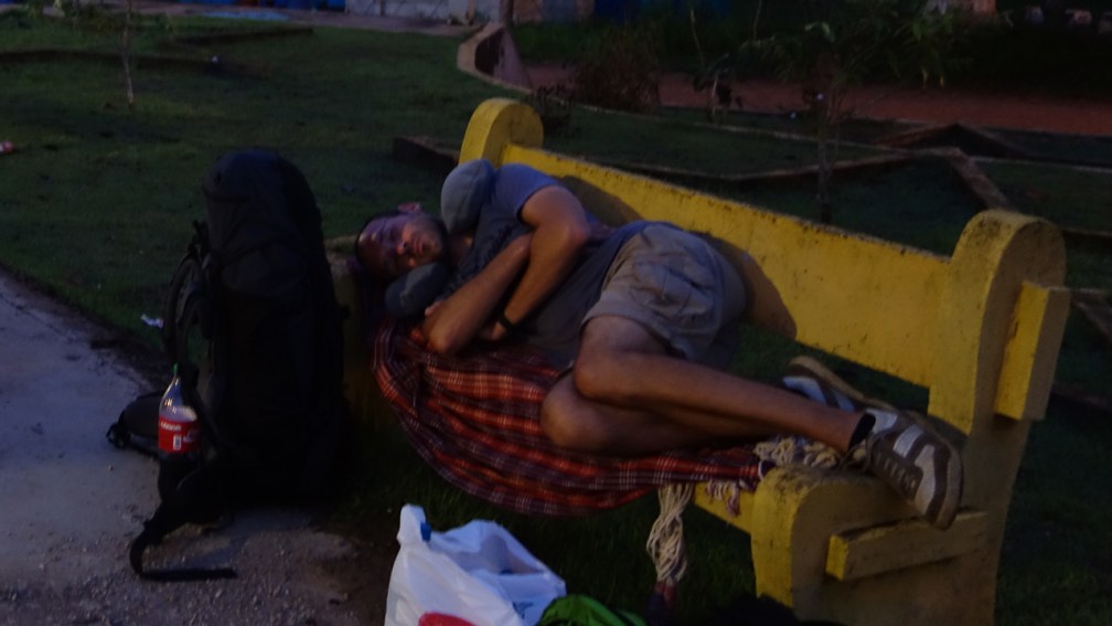 Als wir an einem alten hölzernen Steg anlegen, ist es drei Uhr morgens. Bis auf ein paar einsame Lampen am Pier ist es stockdunkel. Niemand außer uns geht von Bord. Allein stehen wir mit unseren Rucksäcken auf dem Rücken und den Hängematten unter dem Arm an dem völlig verlassenen Pier. Wir schauen noch zu, wie unser Schiff langsam im Dunkel der Nacht verschwindet und dann machen wir uns auf die Suche nach einem Schlafplatz. An dem kleinen Haus am Pier gibt es Haken, an denen wir unsere Hängematten aufhängen können, aber das einzige Licht weit und breit lockt Unmengen an nachtaktivem Getier an und so beschließen wir, uns nach einem anderen Platz umzusehen. Ein Stück das Ufer hinauf können wir den spärlich beleuchteten Kirchturm sehen. Davor ist ein kleiner Spielplatz, auf dem wir es uns auf einer Steinbank so bequem wie möglich machen. Ich versuche zuerst ein bisschen zu schlafen, während Moppi wach bleibt und auf mich und unsere Sachen aufpasst. Nach kurzem und wenig erholsamen Schlaf auf der kalten, harten Steinbank wechseln wir. Ab und zu fährt ein knatterndes Moped durch die Dunkelheit, aber keiner bemerkt uns.