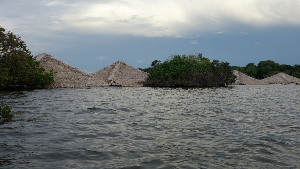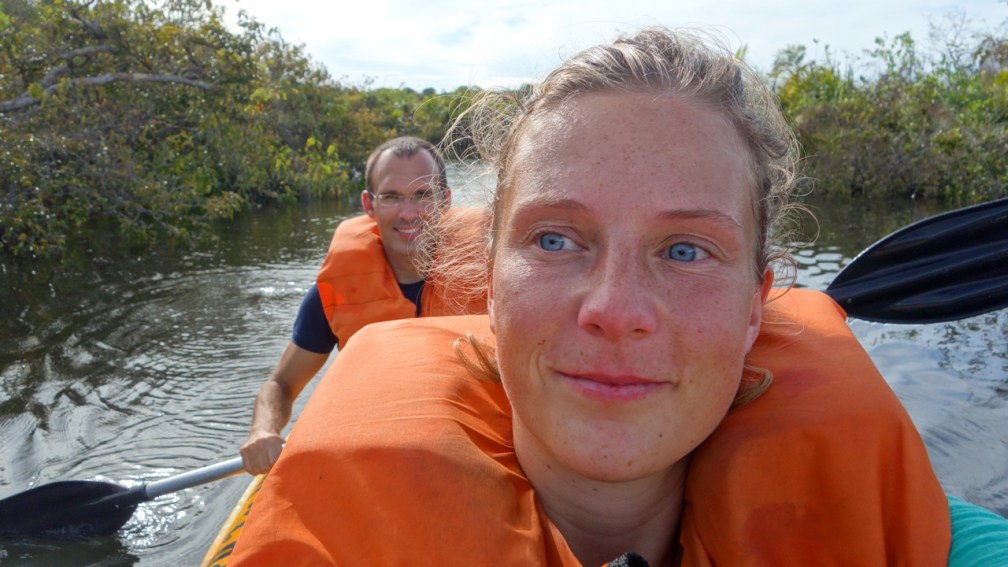 Das Aktivste, was wir in Alter do Chão unternehmen, ist in einer Regenpause ein Kajak zu mieten und damit einen der schmalen Seitenarme des Amazonas, mitten durch den unter Wasser stehenden Regenwald zu paddeln. Als krönenden Abschluss drehen wir dann auf dem Rückweg auch noch eine Runde über die versunkene Insel entlang der Strohdächer und gehen an einer flachen Stelle zumindest einmal im Amazonas baden. Nach vier entspannten und erholsamen Tagen geht es danach mit dem überfüllten Linienbus wieder retour nach Santarém.